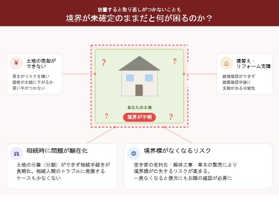 しかし、境界が未確定のままだと、ご自身のライフプランにおいて以下のような重大なリスクが生じます。