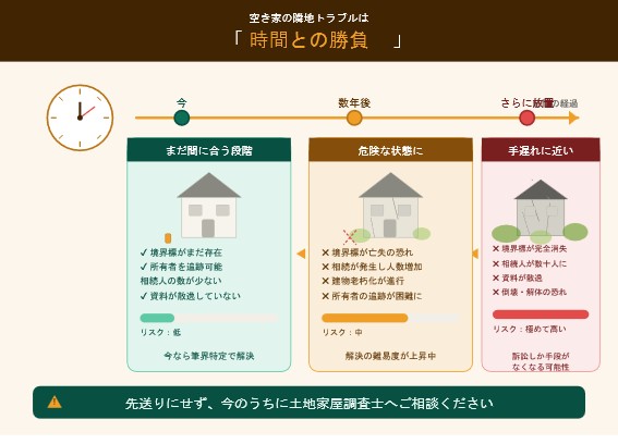 空き家に関する境界問題は、「今は困っていないから」と放置すればするほど、解決の難易度が跳ね上がります。