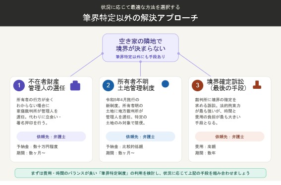 状況によっては、筆界特定制度以外の法的手続きを活用した方がよいケースもあります。