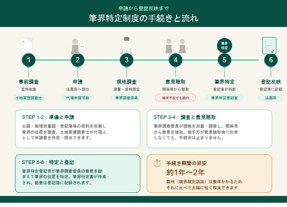 4.  関係者への意見聴取: 対象地および隣接地の所有者に対し、意見を述べる機会が設けられます(※相手が欠席しても手続きは進みます)。