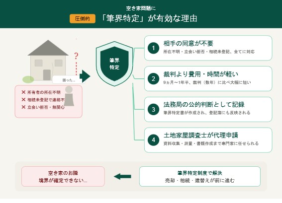 空き家の隣地トラブルにおいて、筆界特定制度は以下の理由から非常に強力な解決策となります。