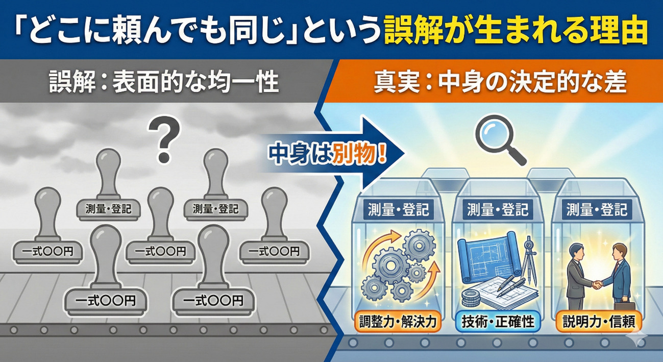 外から見ると「土地を測って、図面を作って、登記申請をする人」に見えやすく、最終的な成果物(登記完了証など)も同じに見えるため、「誰に頼んでも同じだろう」と誤解されがちです。